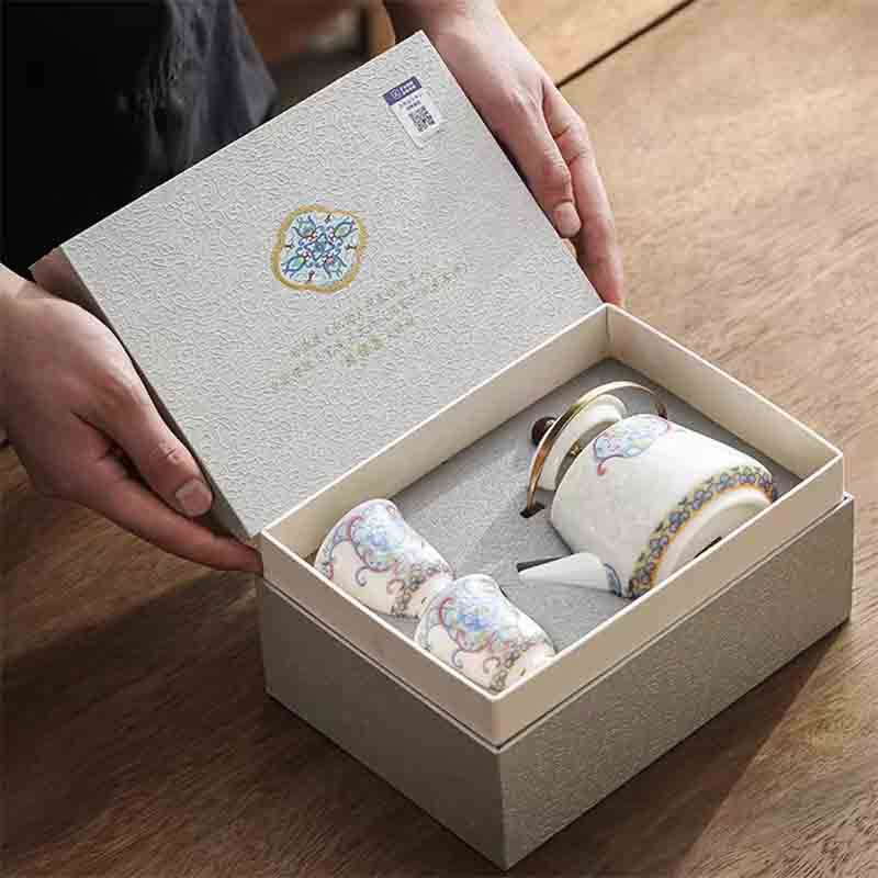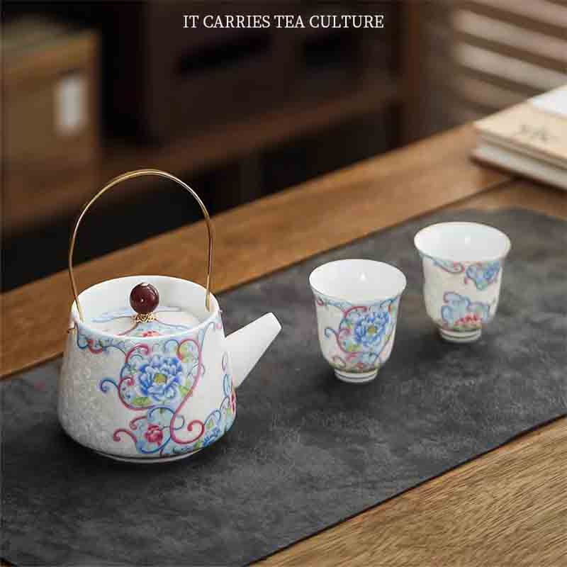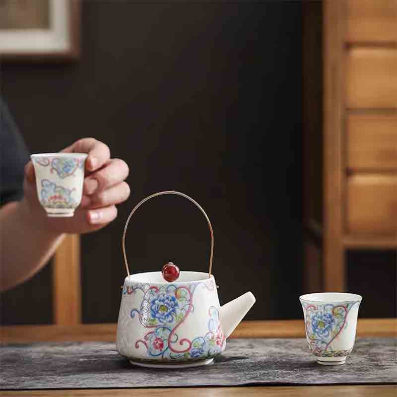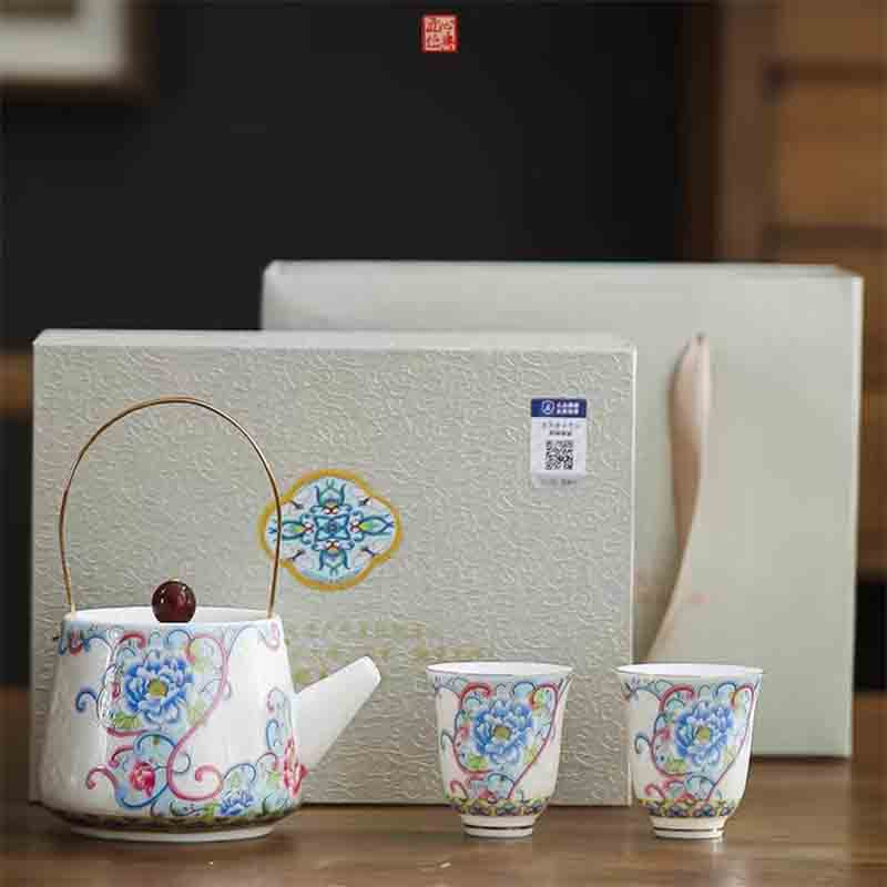 Mutton-fat jade cloisonné enamel handle pot, one pot and two cups, enamel craftsmanship used by the imperial court—Royal Pink